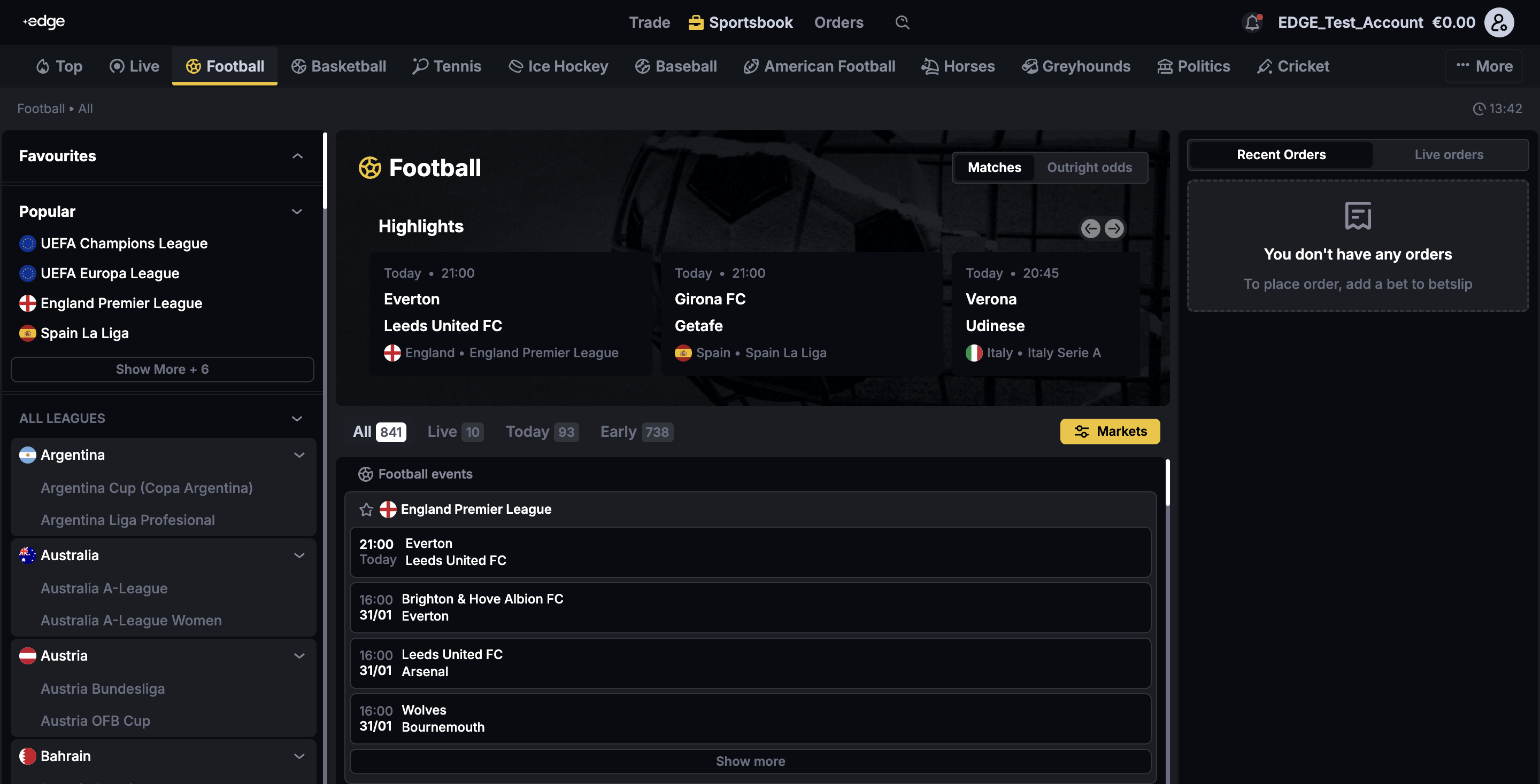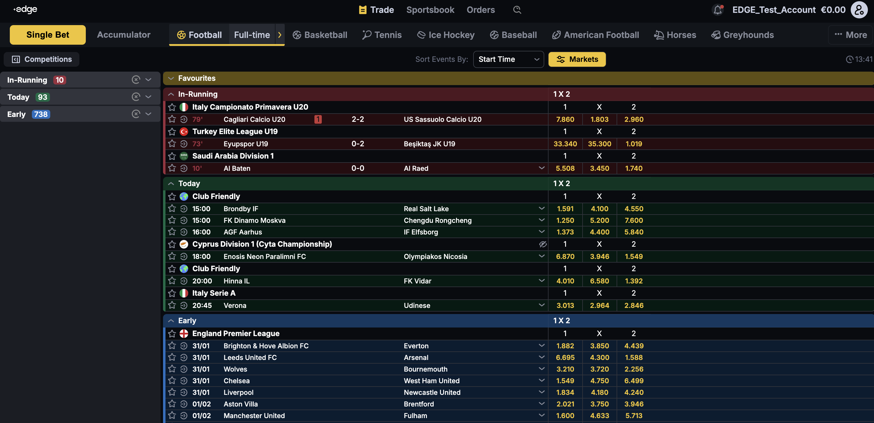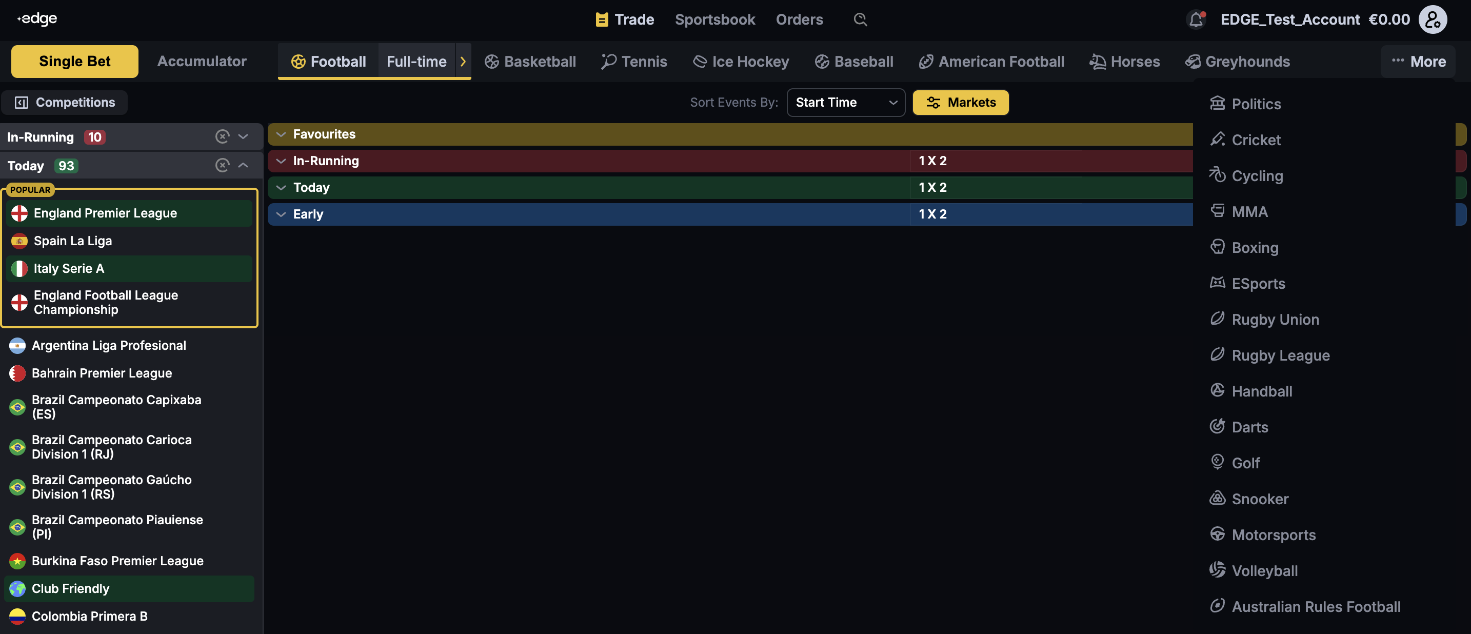 To place a bet on EDGE, start by selecting the sport you wish to bet on from the menu at the top of the screen.